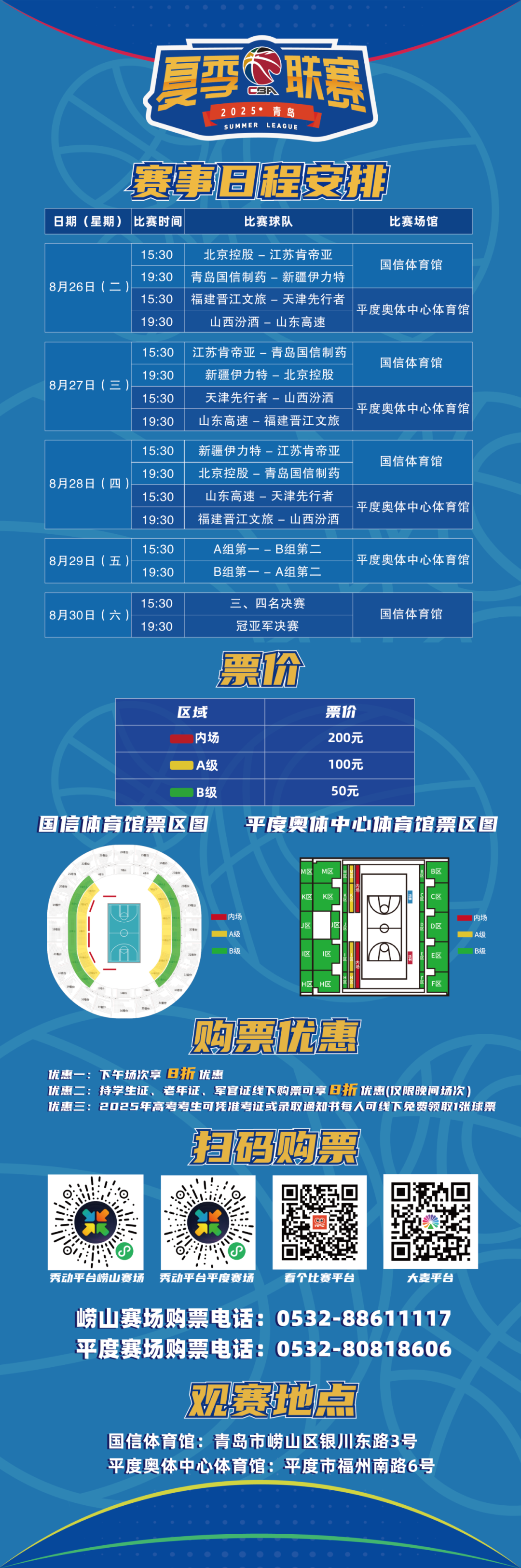 8月30日,聚焦青岛国信体育馆,2025年CBA夏季联赛(青岛)将迎来收官之战。明天下午15:30,青岛国信制药将迎战新疆伊力特,进行三、四名对决。明晚19:30,2025年CBA夏季联赛(青岛)冠军将从山西汾酒和山东高速两支队伍决出,欢迎球迷朋友来现场支持喜欢的球队!