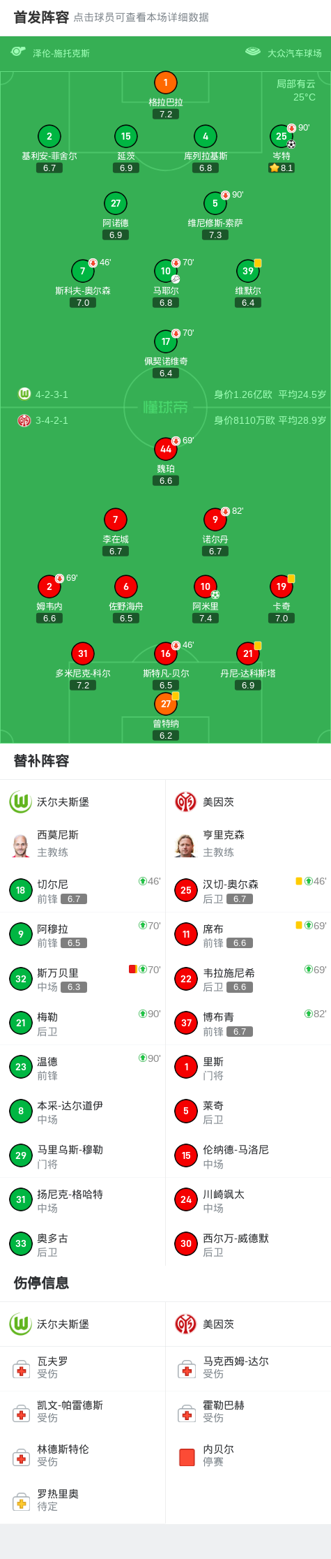 北京时间8月31日德国足球顶级联赛第2轮,沃尔夫斯堡主场迎战美因茨。比赛第9分钟,马耶尔送出助攻,岑特为沃尔夫斯堡首开纪录。第89分钟,阿米里主罚点球命中,帮助美因茨将比分扳平。下半场补时第10分钟,沃尔夫斯堡球员斯万贝里累计两张黄牌被红牌罚下。最终全场比赛结束,沃尔夫斯堡1-1战平美因茨。